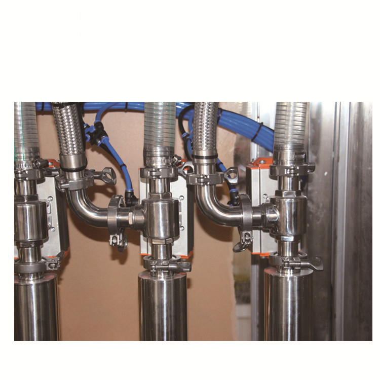 La tavola girevole di avanzamento consegna le bottiglie una ad una al trasportatore SS mobile. Le bottiglie entrano nel punto di riempimento attraverso il trasportatore SS. Ugello di riempimento riempire il volume di liquido preimpostato nella bottiglia. Il blocco di dosaggio a bullone esagonale consente di utilizzare facilmente diversi volumi di riempimento con un tempo minimo di utilizzo. L'azionamento principale è costituito da un cambio azionato da un motore CA e controllato da un convertitore di frequenza CA. La velocità può essere impostata in termini di bottiglie al minuto. L'azionamento del nastro trasportatore è costituito da un motoriduttore ad albero di trasmissione gestito da un convertitore di frequenza CA. Una manopola può impostare la velocità del trasportatore.