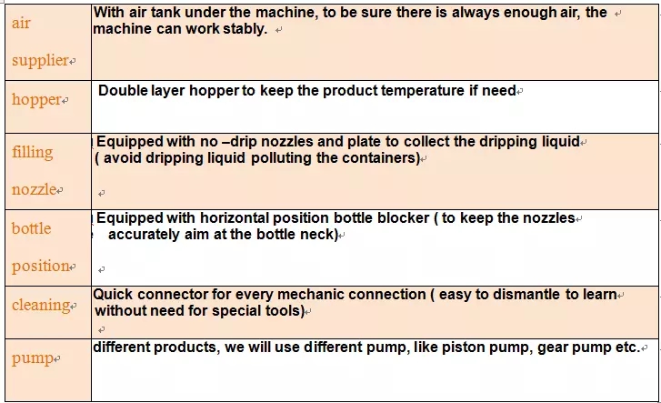 Questa macchina è stata creata appositamente per tutti i tipi di viscosità / liquido nell'industria alimentare, nell'industria chimica e nella comodità, come olio motore, olio motore, insalata, gel per il lavaggio delle mani, olio di cocco, salsa di soia, sesamo, shampoo, sapone liquido, olio motore , olio per freni, olio da cucina, salsa di pomodoro, bevande, olio essenziale, olio vegetale, miele, salsa al pepe, burro di arachidi, yogurt, succo di frutta, bevande ecc. Tutta la parte a contatto con il liquido / salsa è in acciaio inossidabile di alta qualità. adotta la pompa a pistone per il riempimento. Regolando la pompa di posizione, può riempire tutte le bottiglie in una macchina riempitrice, con velocità rapida e alta precisione.